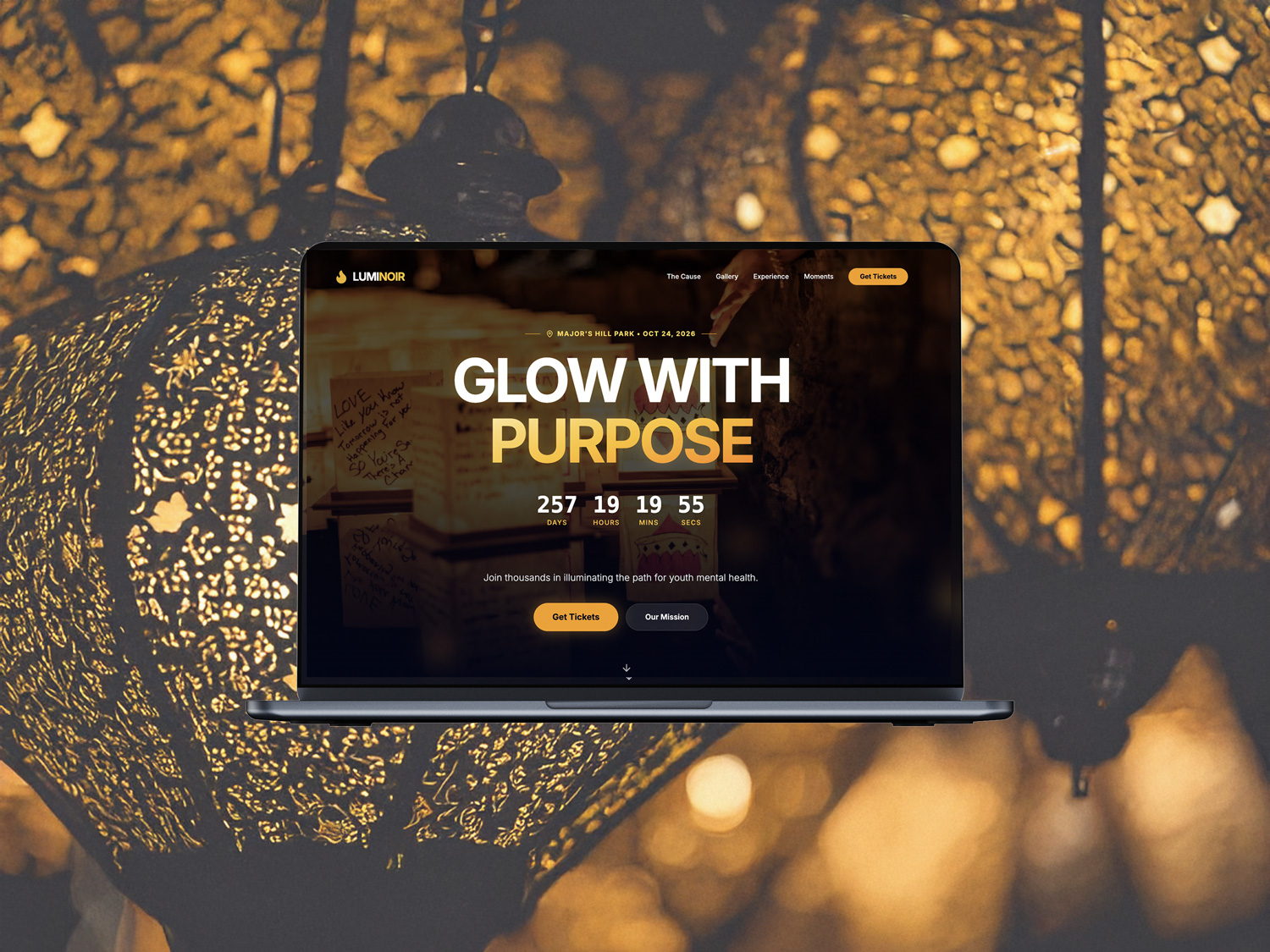 A digital home for Ottawa's lantern-lit evening festival. The concept "Glow With Purpose" connects family-friendly fun with youth mental health support, guiding visitors through a magical night.